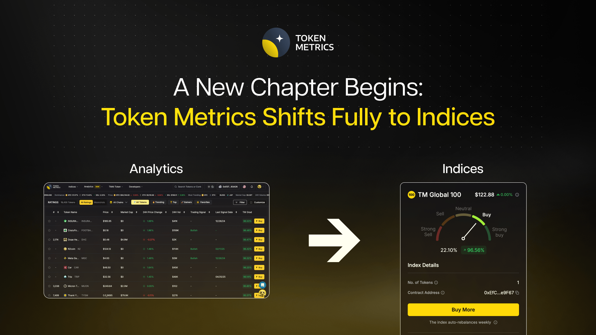 The crypto landscape has shifted. There are now many research and analytics tools that appear similar, while the real differentiation is shifting toward on-chain products that enable you to own the market itself, simply and non-custodially. Over time, the strongest and most consistent interest around Token Metrics has centered on our indices, especially TM100, rather than new features in the Analytics platform or raw data feeds.